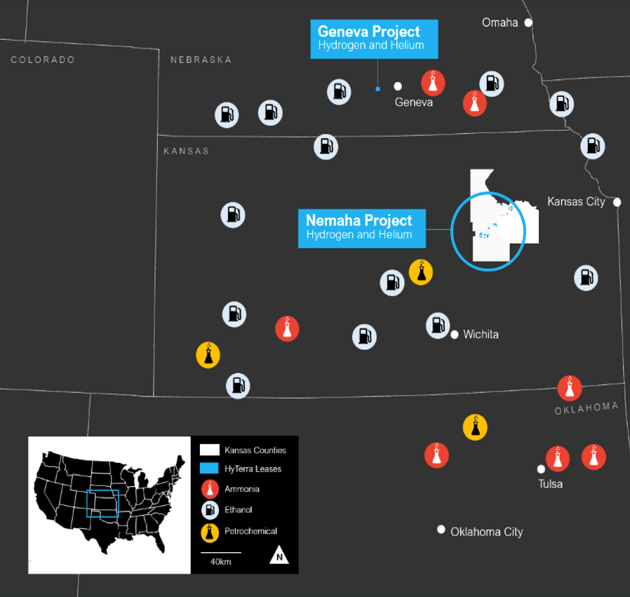 Our Nemaha Project in Kansas, USA, holds 100% owned and operated leases across the emerging Nemaha Ridge natural hydrogen and helium play fairway. Our Geneva Project in Nebraska, USA, is a 16% earn-in interest in a Joint Development with Natural Hydrogen Energy LLC targeting natural hydrogen and helium.